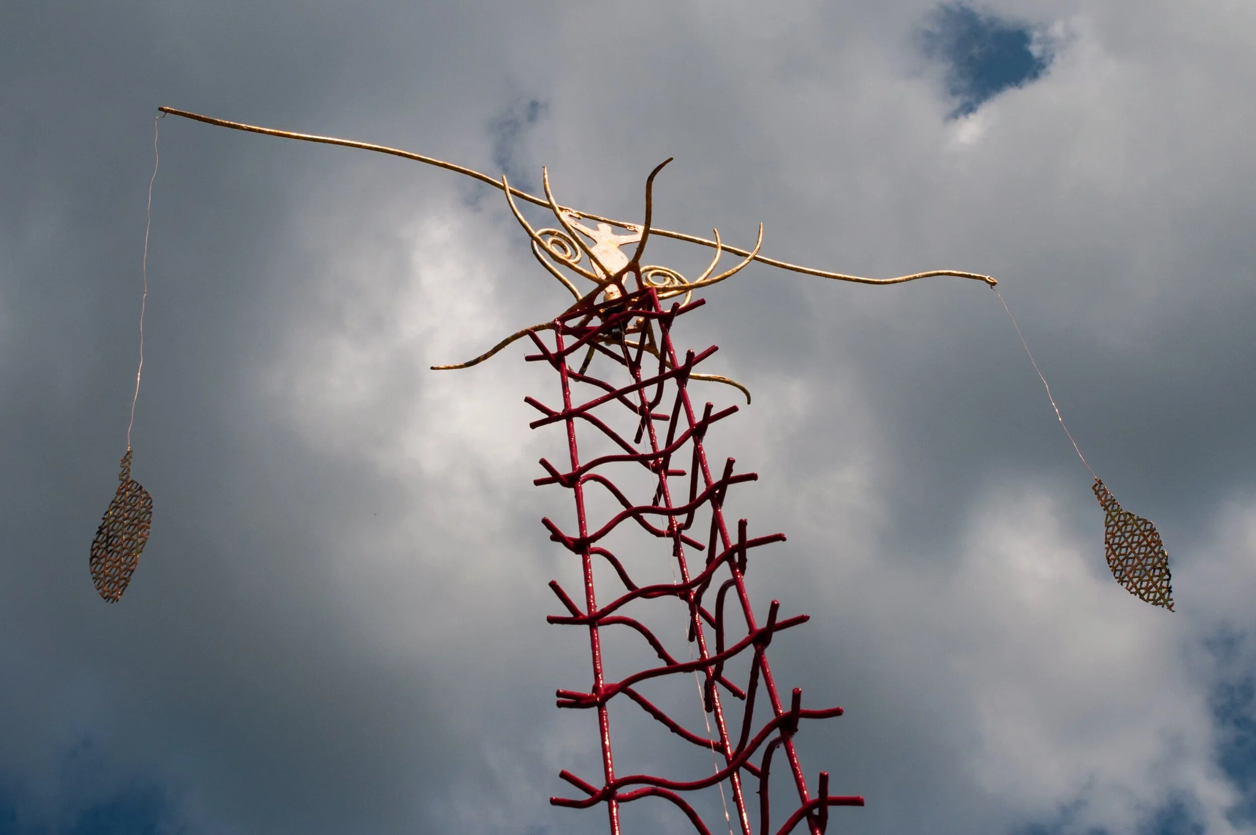 My sentinels keep watch or stand guard over our sacred lands and also symbolize the interface between technology and the environment. Inspired by the ubiquitous cell phones towers in our lives today, they also incorporate iconic images from ancient civilizations. Drawing energy from the earth, these Sentinels simultaneously broadcast warnings about the climate destruction we now face, while sending out waves of healing energy.