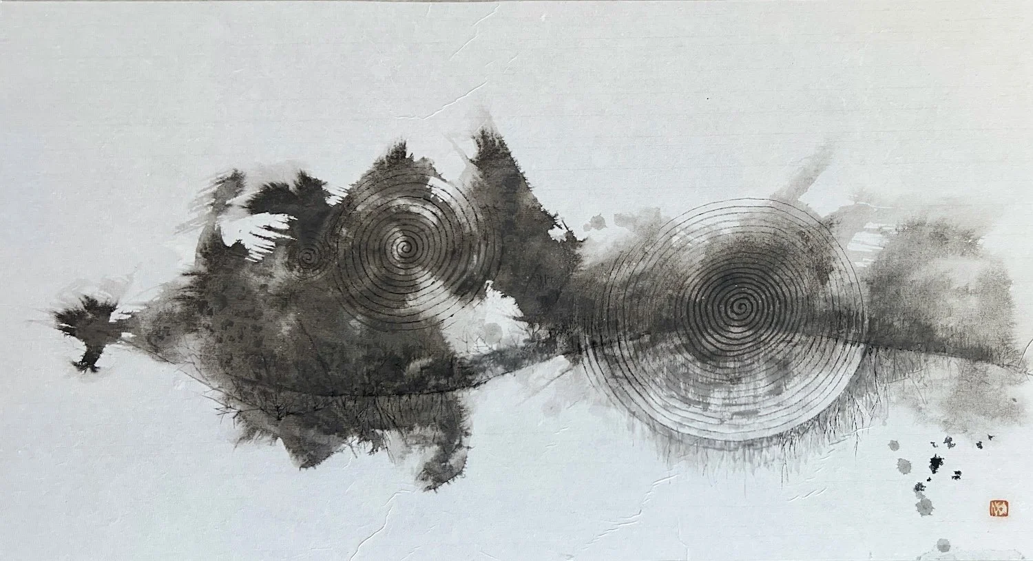 This artwork was inspired by my view of the Rocky Mountains from an airplane. The mountain ridges resembled leaf veins, roots, blood vessels, and nerve cells, revealing the macro and micro similarities in nature and the cosmos. This vision connects to the concept of "Tenchi Dokon," where all things in the universe are linked to a single root. Every aspect of life, no matter how small, is part of the cosmos and connected to the greater universe. With this in mind, I created this piece, using the interplay of ink and water on paper to symbolize these veins and the roots that connect everything.